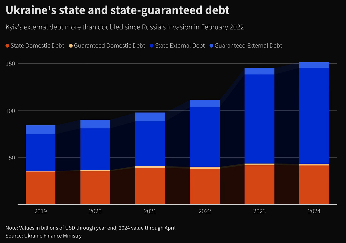 Как вы видите из первого графика, долг значительно увеличился за последние несколько лет. Общий объем долга Украины (на конец апреля 2023 года) составил $152 млрд. Из них более 70% ($108,4 млрд) - внешний долг, а оставшаяся часть - внутренний долг (который в случае чего, можно решить печатью денег).
