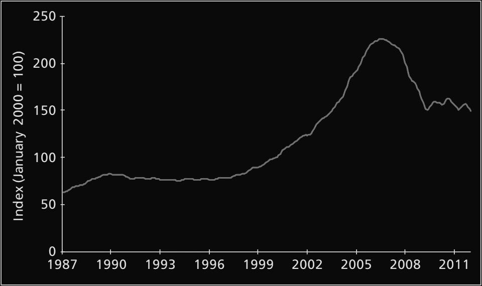 Сочетание низких процентных ставок и стабильной экономики привело к буму на рынке недвижимости. Цены на жилье в США начали расти в конце 1990-х и ускорились после 2001 года, когда процентные ставки резко упали. За 10 лет с 1997 года средние цены на недвижимость утроились (график 3).