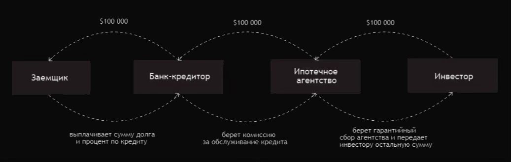 На схеме 1 показан путь денежных потоков от первоначального заемщика до конечного инвестора в случае ипотечной ценной бумаги. Начинается всё с того, что организация, предоставившая кредит (например, банк), выдает заемщику кредит на, скажем, $100 000. Заемщик выплачивает основную сумму и проценты по кредиту в течение 30 лет. Затем кредитор продает этот кредит компании, такой как Freddie Mac или Fannie Mae, и получает обратно свои деньги.