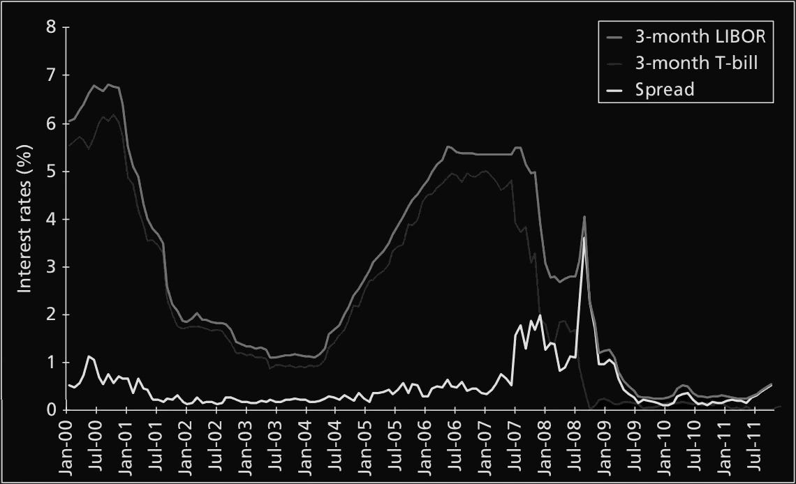 График 1. Краткосрочные LIBOR, Treasury-bill rates и TED spread