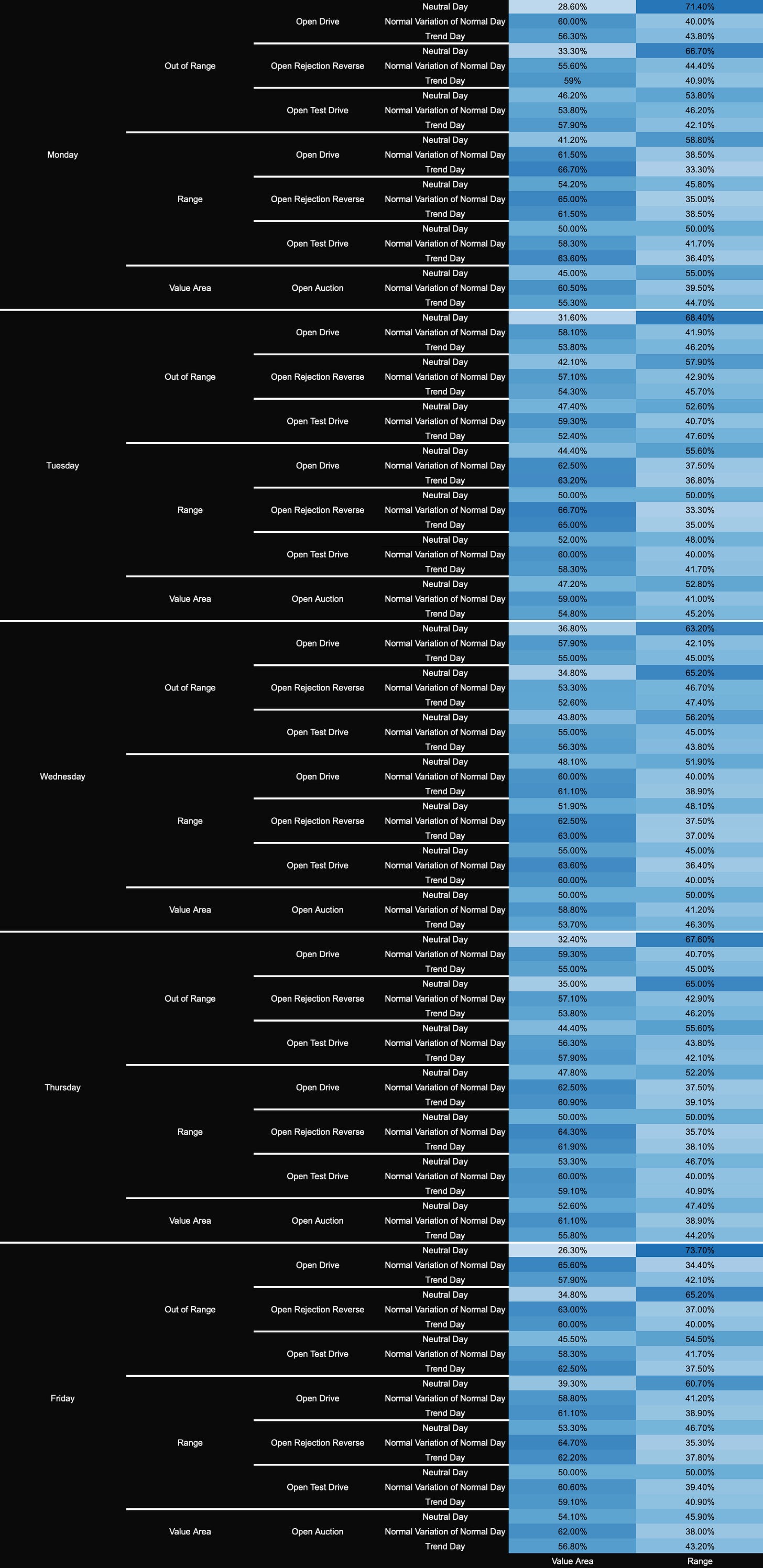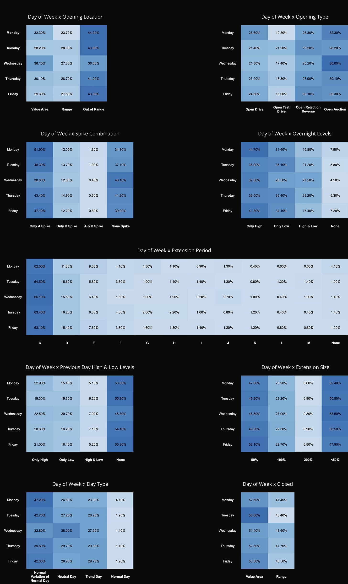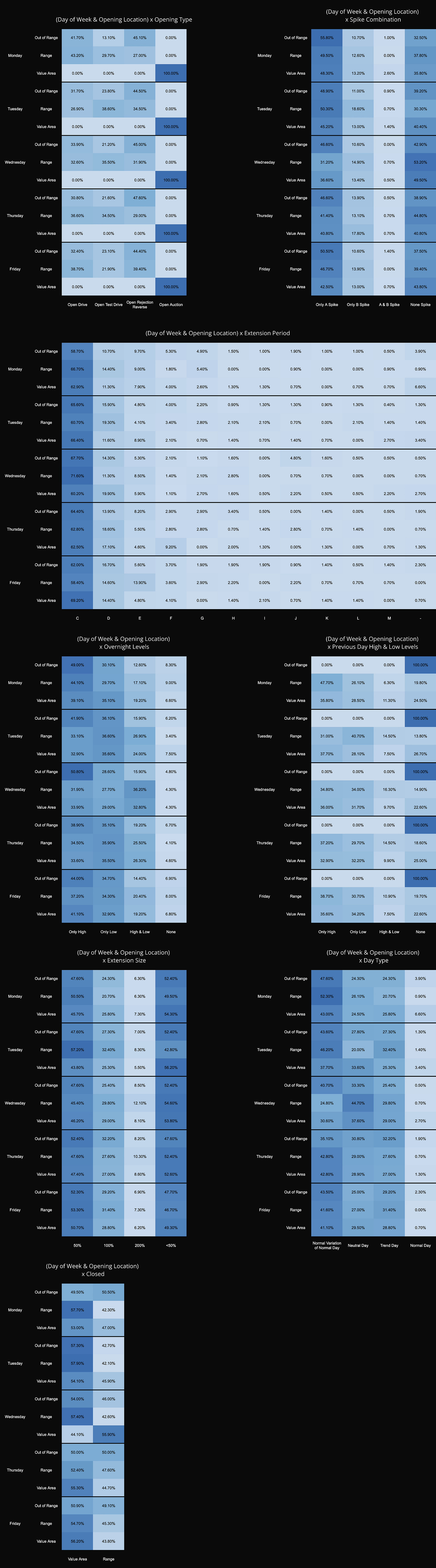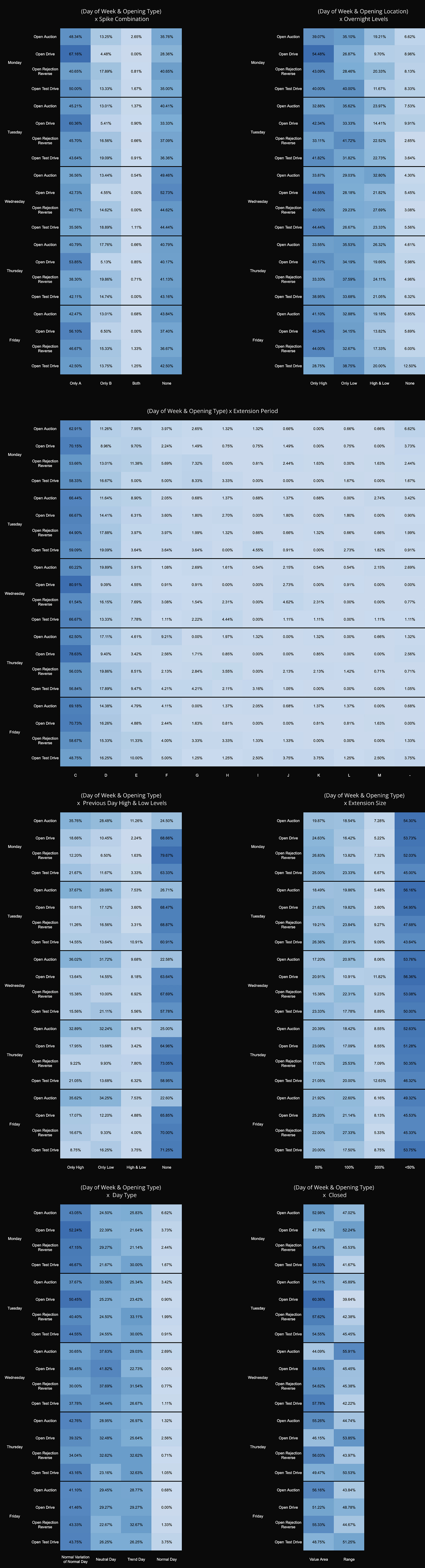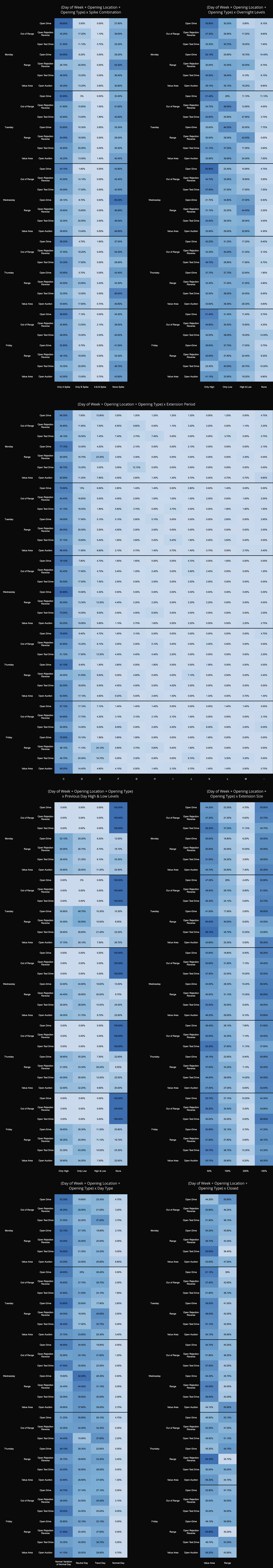 Такой подход позволяет понять, как начальные условия торгового дня (место открытия, характер открытия и структура самого дня) влияют на то, каким образом рынок завершает сессию. Это даёт основу для оценки сценариев от начала до конца торгов и выявления закономерностей перехода от стартового баланса к финальной точке закрытия.Та же комбинация, но с добавлением Day of Week к Opening Location, Opening Type и Day Type.