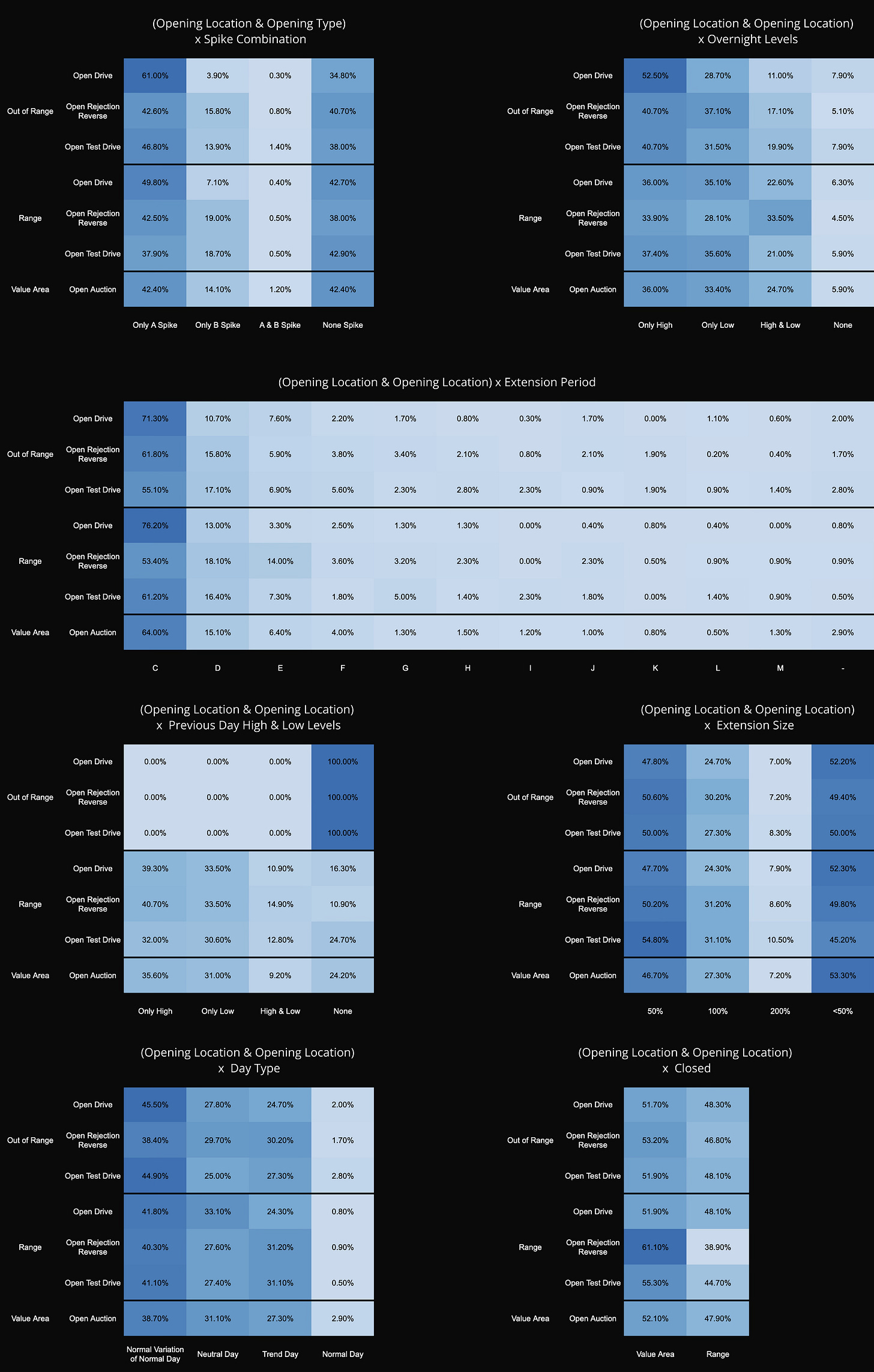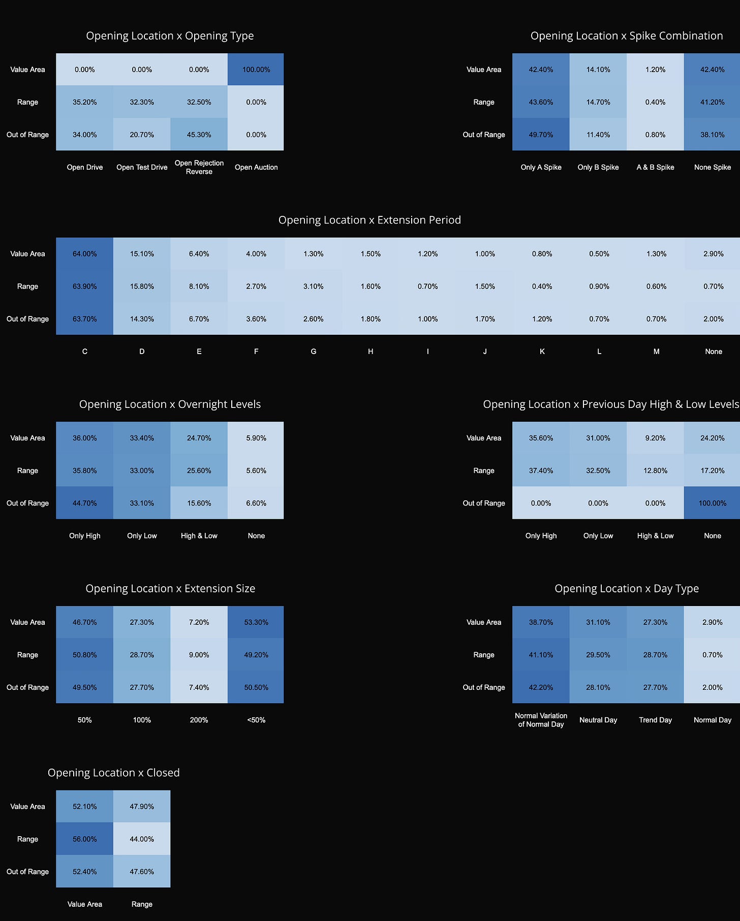 При работе с тремя переменными в качестве основы используются две базовые. Такой подход идеально подходит для анализа, поскольку Day of Week, Opening Location и Opening Type известны уже в первый час торгов. Это даёт возможность прогнозировать возможные сценарии развития событий на протяжении оставшейся части сессии.