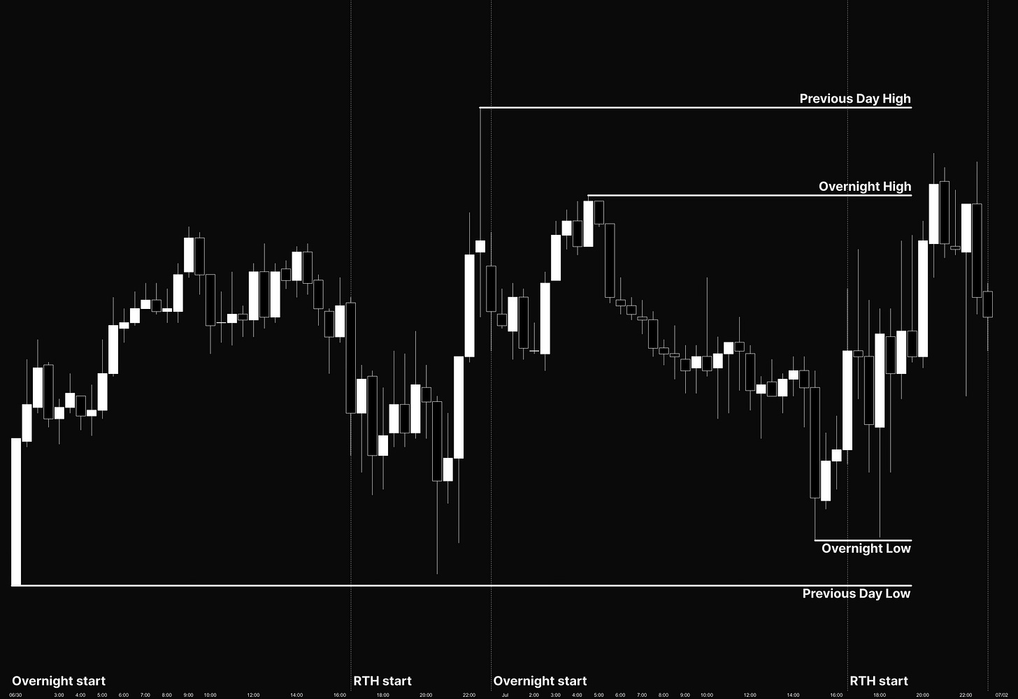 Именно эта структура позволяет корректно работать с уровнями: Previous Day High & Low предыдущей сессии и Overnight High & Low текущего дня. Эти уровни представляют не просто ценовые отметки, а ключевые ориентиры, отражающие баланс сил между участниками рынка.