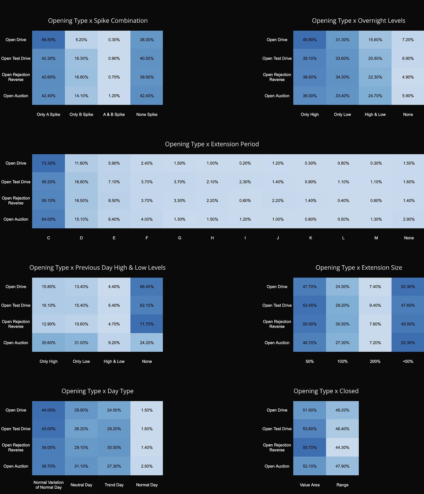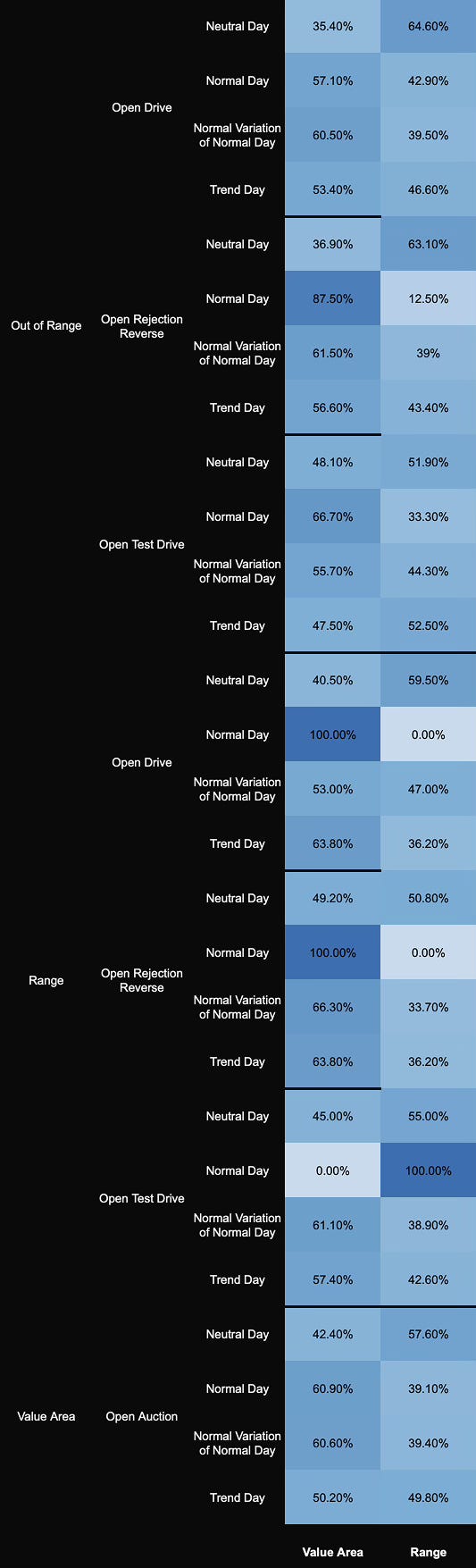 Место открытия Value Area практически не пересекается с другими типами открытий, за исключением Open Auction, поскольку оба варианта предполагают нахождение рынка в состоянии баланса. Аналогично, Open Auction не имеет значимой связи с остальными местами открытия.