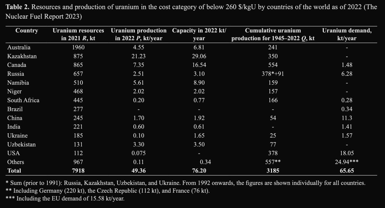 Ядерная энергетика активно развивается по всему миру, особенно в таких странах, как Китай, Индия и США. Но несмотря на эти тенденции, добыча природного урана в последние годы сокращается, и каждый год увеличивается дефицит между его производством и потреблением. Этот разрыв составляет около 20 тыс. тонн урана ежегодно, и пока его восполняют за счёт существующих запасов. Такая ситуация может привести к резкому скачку цен на уран в ближайшем будущем, когда запасы начнут исчерпываться, так как они не безграничны. Ниже приведен список стран с крупнейшими месторождениями урана и их метрики запаса ресурсов, производительности, потребления и дефицита.