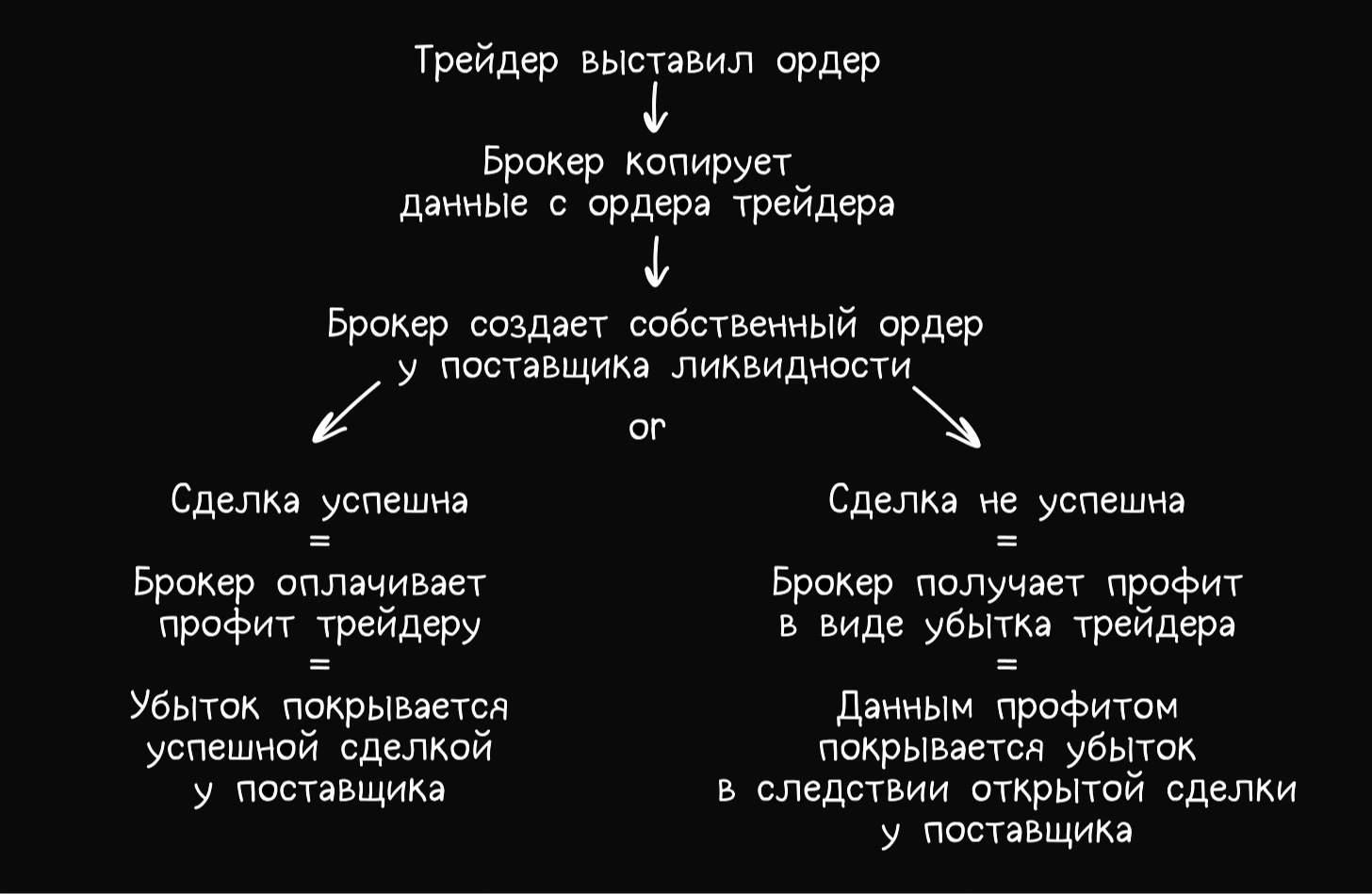 В рамках данного формата, брокер не использует инструмент диверсификации в виде поставщика ликвидности, а замыкает всю цепочку от “исполнения ордера” до результата сделки самостоятельно.