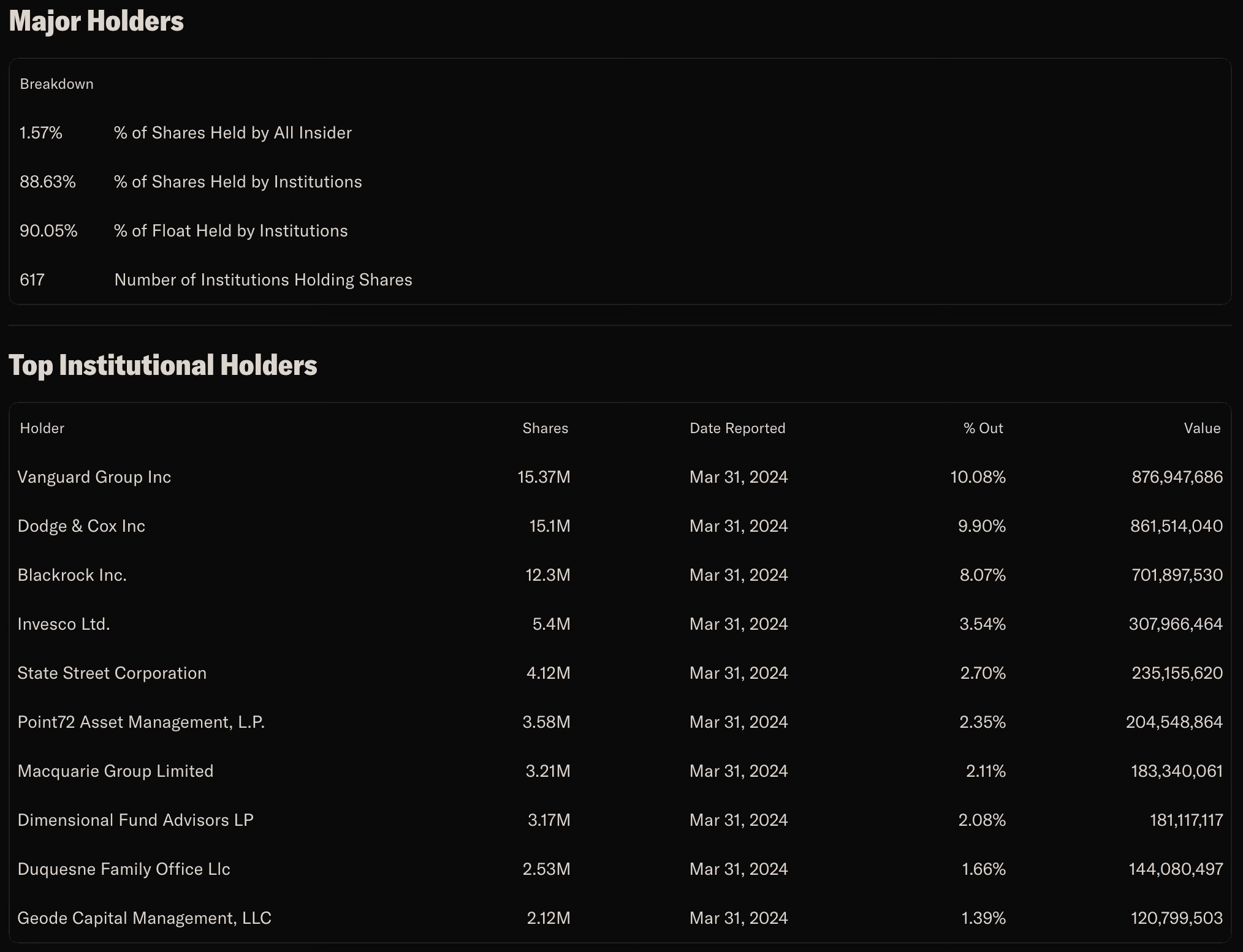 Интерес к компании со стороны крупных финансовых институтов достаточно высокий. 88.63% всех акций компании принадлежат институционалам. Наибольшие доли в акциях компании принадлежат Vanguard Group Inc. (10.08%), Dodge & Cox Inc. (9.90%), и Blackrock Inc. (8.07%). Так же я отметил бы фонд Стэнли Дракенмиллера, Duquesne Family Office Llc, который вледеет 1.66% компании, что для его портфеля составляет - 3.5%.