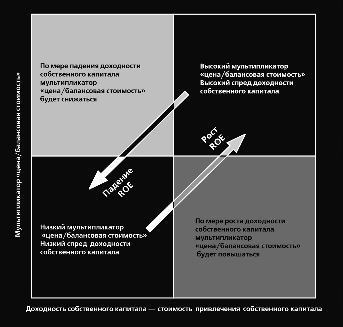 Ниже приведена матрица, которая помогает визуализировать положение компании в зависимости от ее коэффициента рентабельности собственного капитала (Return on Equity) и цены/балансовая стоимости (Price to Book).