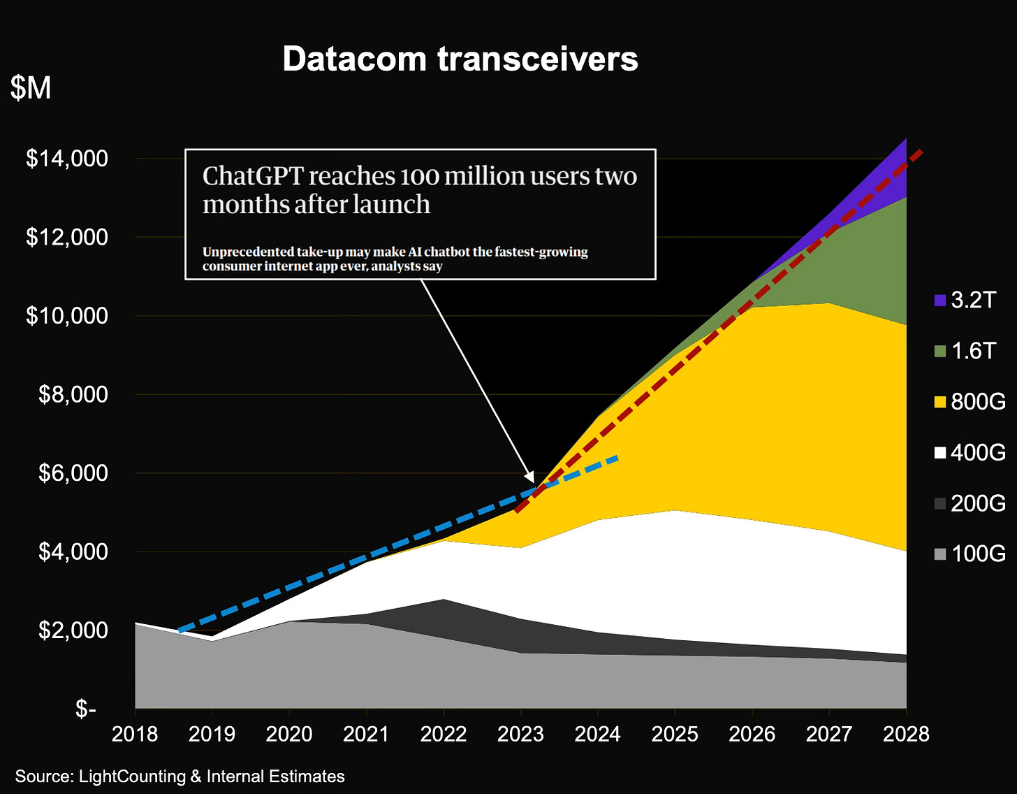Рост доходов на рынке телекоммуникаций вызван спросом на трансиверы 800G и выше для центров обработки данных, которые обслуживают приложения искусственного интеллекта и облачные вычисления. Развитие ИИ только способствует переходу человечества на новый уровень в технологиях, а новые технологии требуют большей скорости. По прогнозам руководства компании Coherent, ближайшие 5 лет доминирующее положение займет скорость передачи данных - 800G/1,6T:
