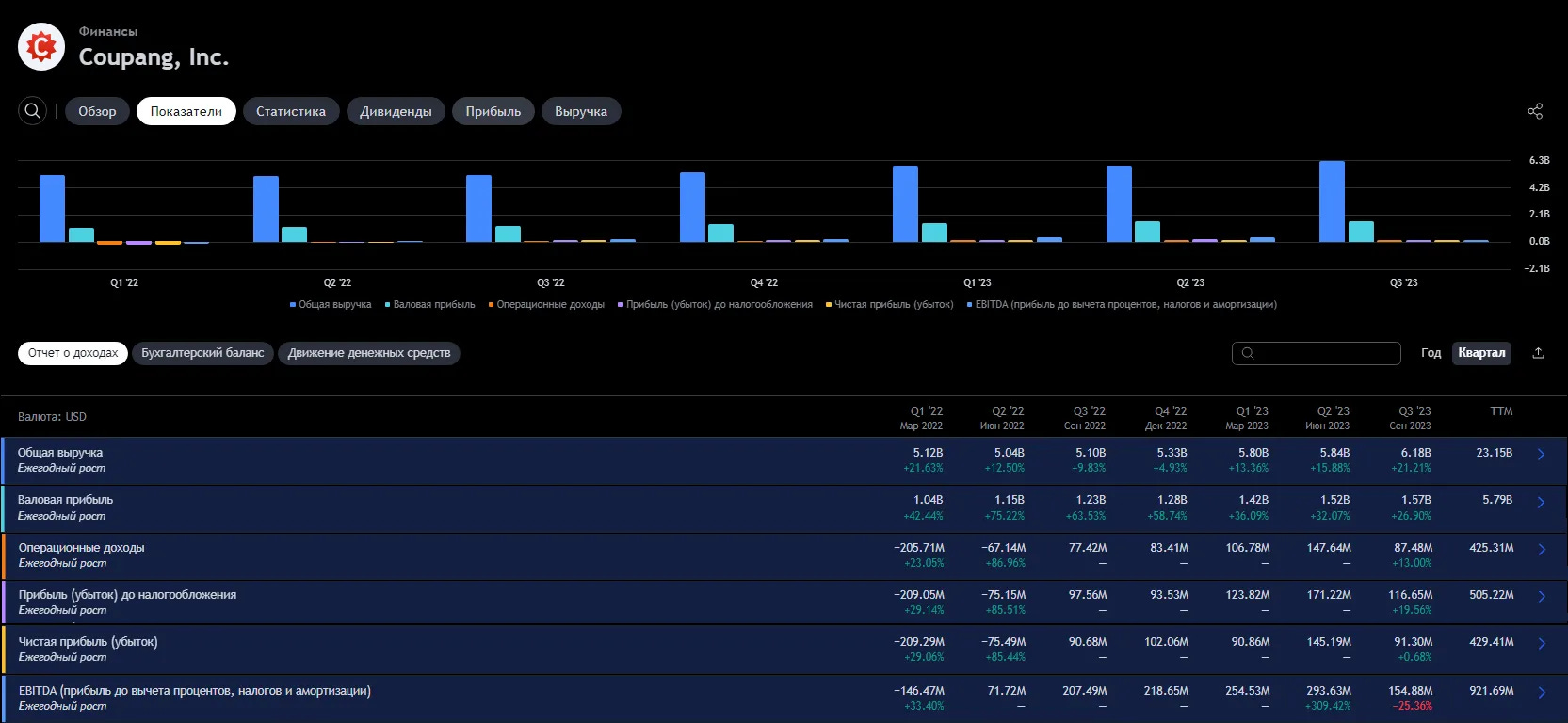 В 2021 финансовом году у Coupang наблюдался сильный рост выручки, но в то же время существенное падение прибыльности и отрицательная EBITDA.