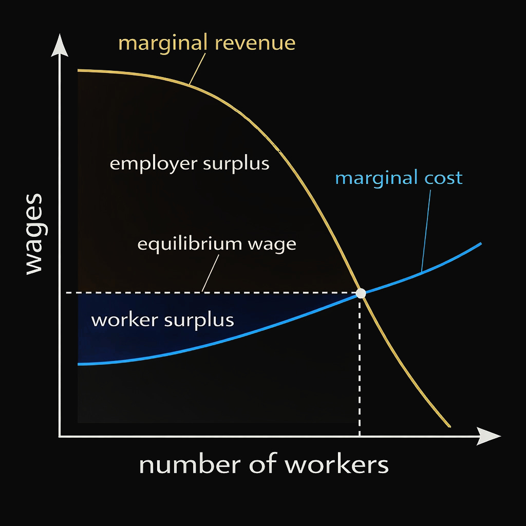Точка пересечения этих двух кривых — оптимальный для фирмы объём занятости. В этой точке дополнительный доход от работника равен дополнительным издержкам на его найм. Ниже этой точки фирме выгодно нанимать ещё, но если выше, то выгода теряется. Горизонтальная пунктирная линия через эту точку показывает установленную зарплату.