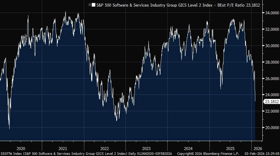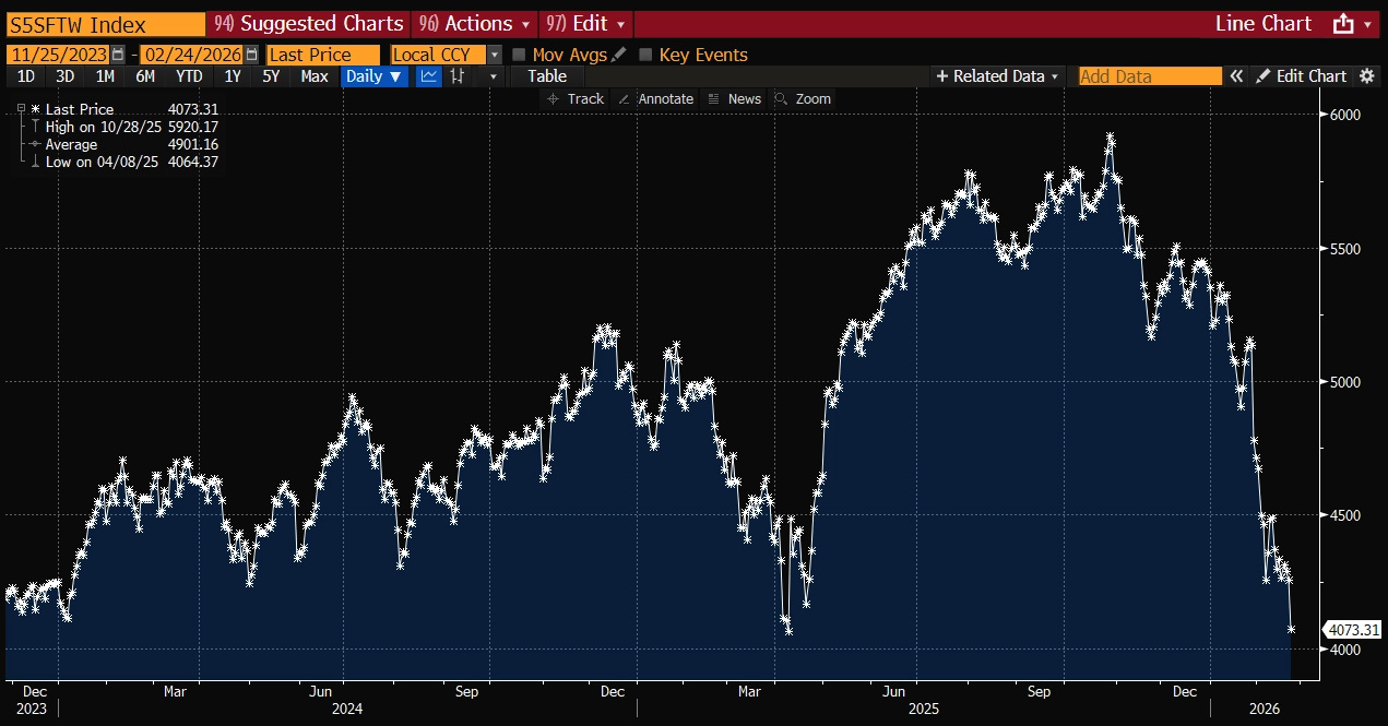 Но рынок видит только одну сторону картины и впадает в панику. Индекс software компаний рухнул на треть с октября, что было вызвано взрывом новостей об ИИ. Инвесторы поставили на полный крах всей SaaS-модели, будто завтра всё исчезнет.