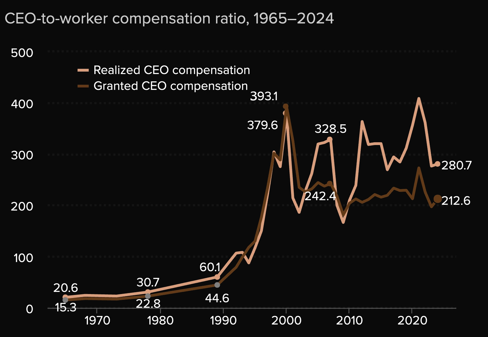 Отсюда постоянная логика поиска территорий компаниями, где рабочая сила стоит минимально, имея ввиду колониальные системы, а затем офшоринг производства, вынос фабрик и сервисных центров в регионы с дешёвой рабочей силой, эксплуатация мигрантов и прочие формы удешевления живого труда. В основе всего этого стоит расширение разрыв между тем, сколько стоит час труда на рынке труда, и тем, во сколько капиталист может реализовать результаты этого часа на рынке товаров и услуг. И именно поэтому мы видим стремящийся разрыв в зарплатах между руководством и работником.