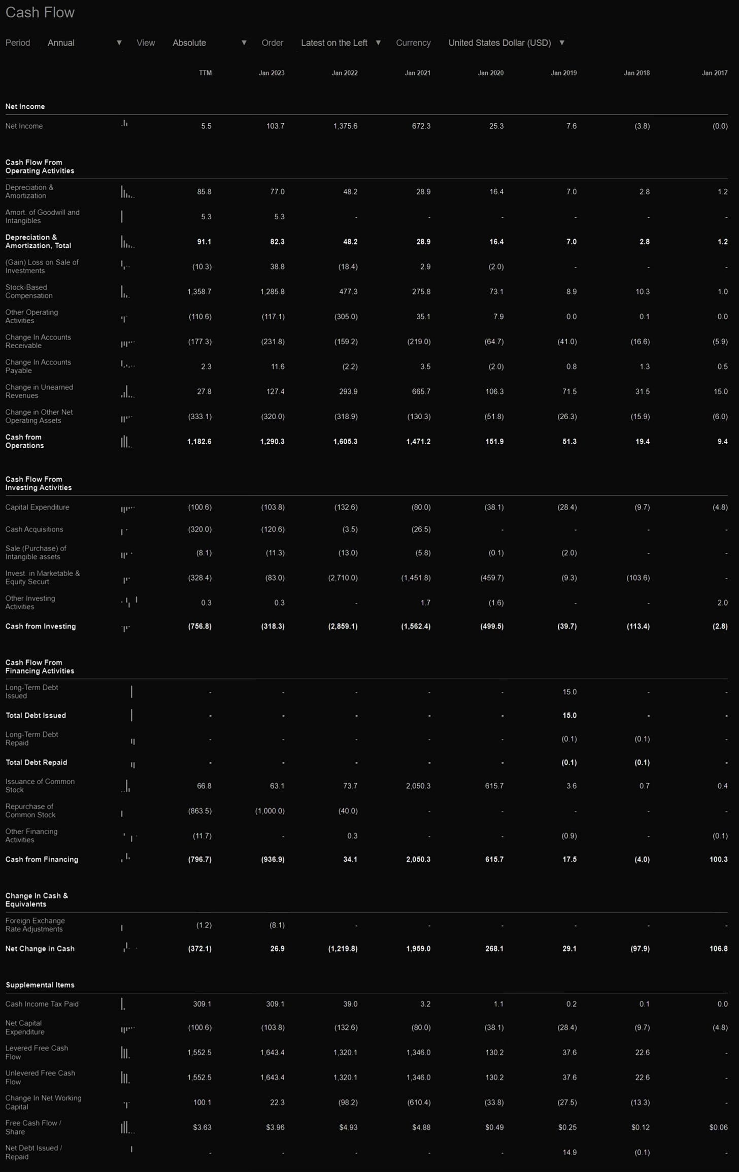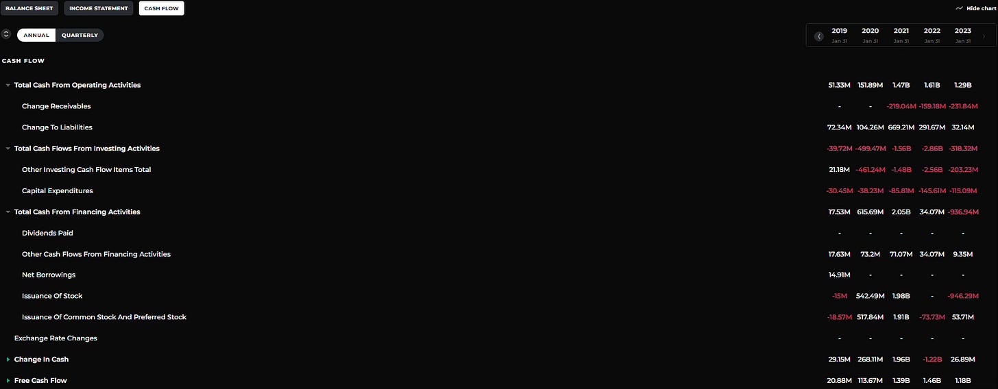 Это определенно важнейший раздел. Тут важно отметить: Cash from Operations (Денежные средства от операционной деятельности), Cash from Investing (Денежные средства от инвестирования), Cash from Financing (Денежные средства от финансирования) и Free Cash Flow (Свободный денежный поток).