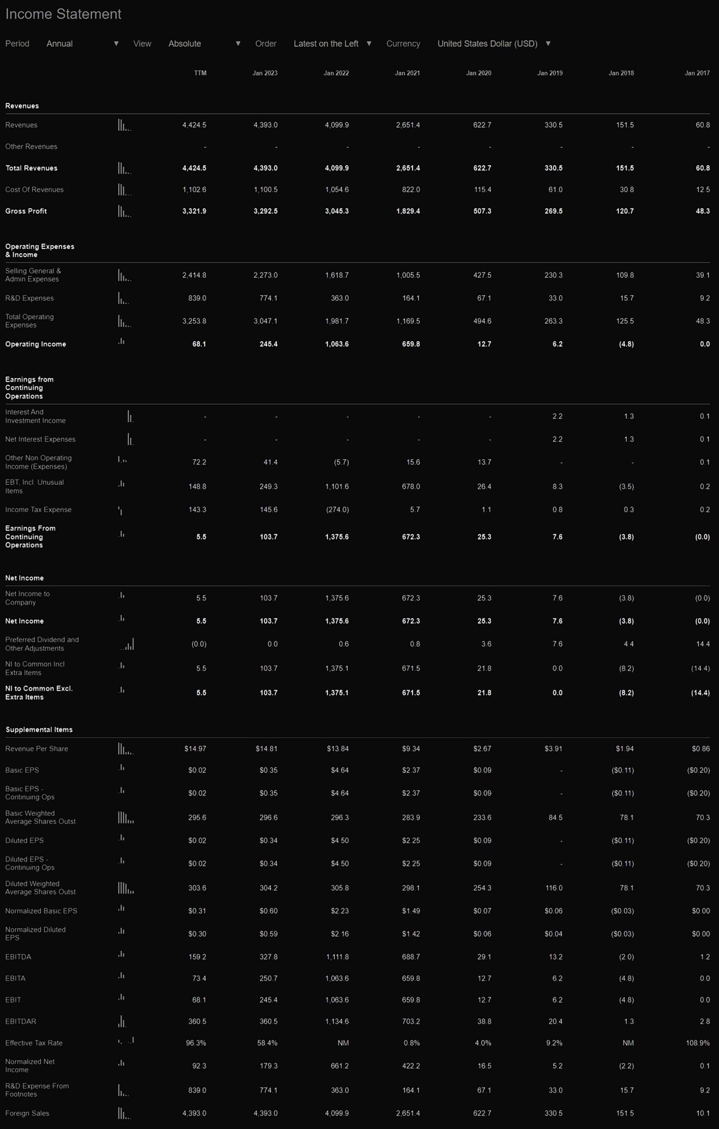 На что я обратил внимание этом разделе: Revenue (выручка), Gross Margin (валовая прибыль), Operating Income (операционная прибыль), Net Income (чистая прибыль). Если смотреть в SeekingAlpha, то важным пунктом является EBITDA (финансовая производительность).