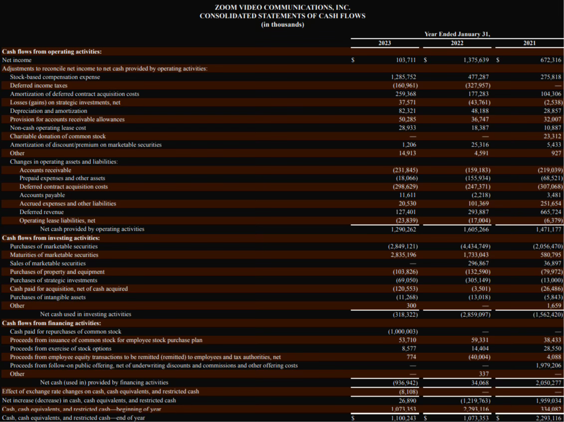 Да, мы видим значительное уменьшение FCF, но компания продолжает генерировать прибыль в условиях кризиса и жестокой конкуренции с техно-гигантами. Free Cash Flow превышает $1 млрд, что является отличной финансовой подушкой для компании Zoom, Inc., которую тратят с пользой.