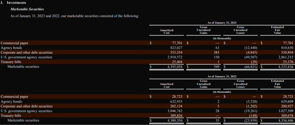 “Чистые денежные средства, использованные в финансовой деятельности в размере $936,9 млн. за финансовый год, закончившийся 31 января 2023 года, были в основном связаны с денежными средствами, уплаченными за выкуп обыкновенных акций в размере $1,0 млрд., что было компенсировано поступлениями от выпуска обыкновенных акций в соответствии с нашим планом покупки акций сотрудниками (ESPP) в размере $53,7 млн. и поступлениями от реализации опционов на акции в размере $8,6 млн. Чистые денежные средства, полученные от финансовой деятельности в размере $34,1 млн. за финансовый год, закончившийся 31 января 2022 года, были в основном связаны с поступлениями от выпуска обыкновенных акций в соответствии с нашим ESPP в размере $59,3 млн, поступлениями от реализации опционов на акции в размере $14,4 млн, компенсированными поступлениями от продажи акций международным сотрудникам, перечисленными сотрудникам и налоговым органам в размере $40,0 млн.”