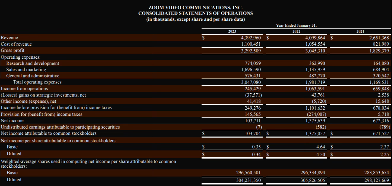 Мы видим снижение операционных доходов и аргументацию к этому. Но в тот момент как большинство компаний сокращало штат, таким образом снижая операционные расходы, компания Zoom этим не воспользовалась.
