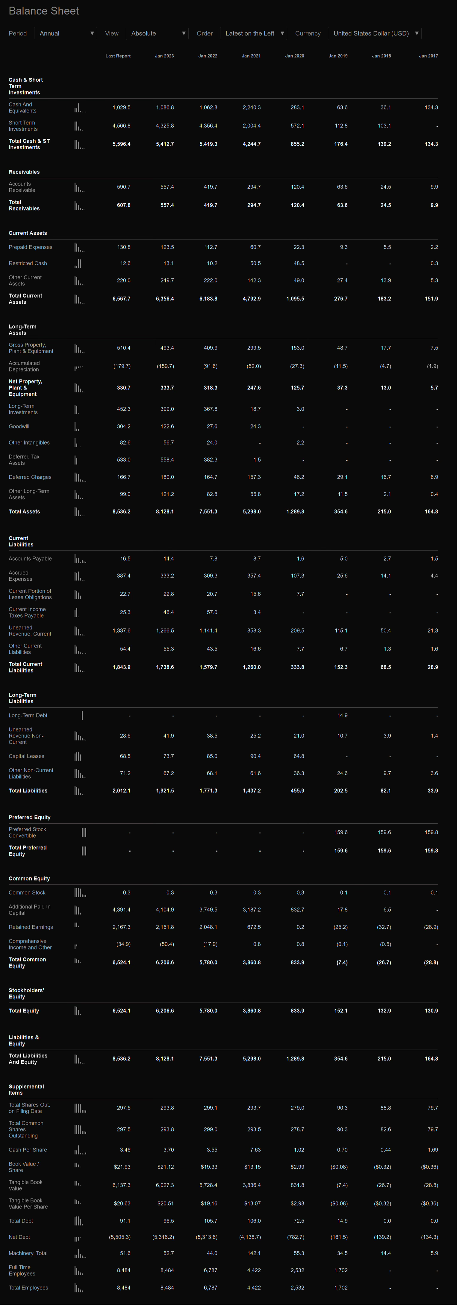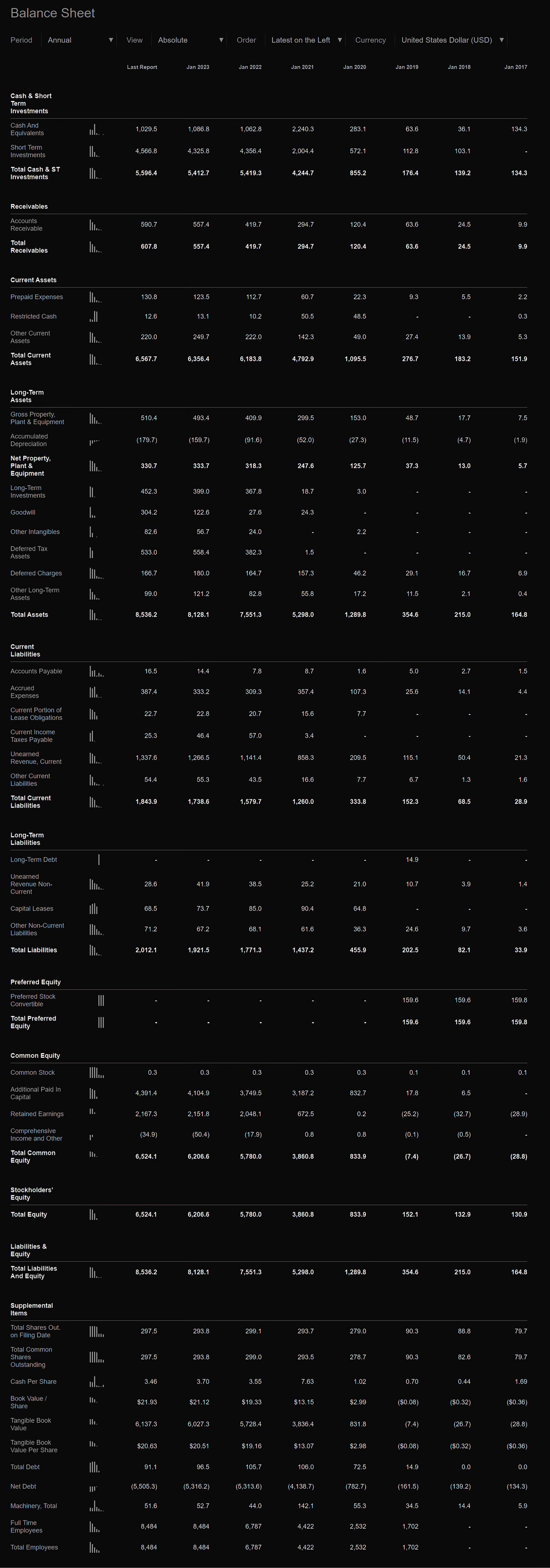 В этом разделе стоит обратить внимание на Total liabilities (обязательства), Equity (капитал), Total Employees (Кол-во сотрудников), Retained earnings (Нераспределенная прибыль), Debt (долг) и Goodwill (репутация).
